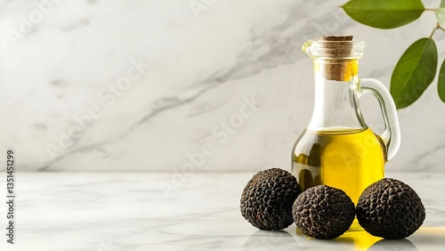A glass bottle of oil with a cork stopper beside three black spherical objects on a marble surface. Concept Glass Bottle of Oil, Cork Stopper, Black Spherical Objects, Marble Surface