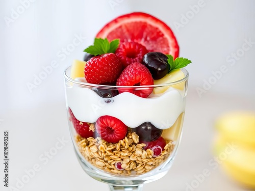 A glass filled with fresh cream, fruits, and cereal topped with berries