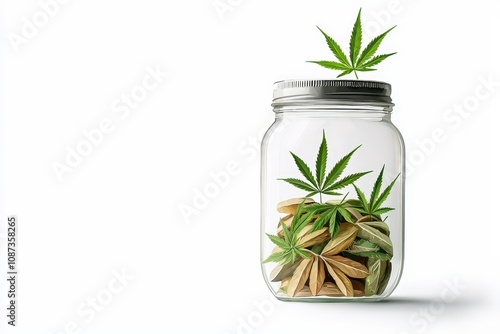 A glass jar filled with seeds and topped with vibrant cannabis leaves, symbolizing growth and sustainability.