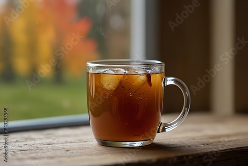 a glass mug filled with hot coffee on a wooden surface, with colorful autumn trees visible through a window in the background, detailed lighting, high resolution