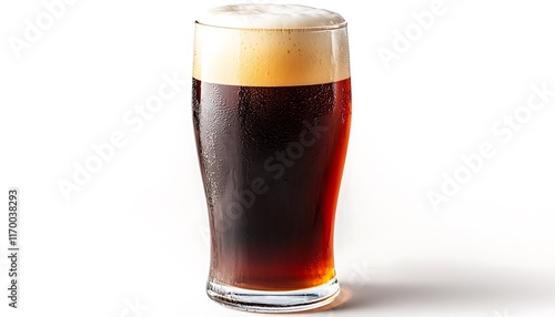 A glass of dark beer with a frothy head, showcasing its rich color and texture.
