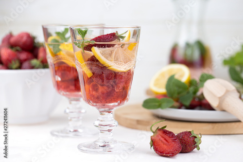 A glass of detox water. Strawberry, lemon and mint with cool clean water.