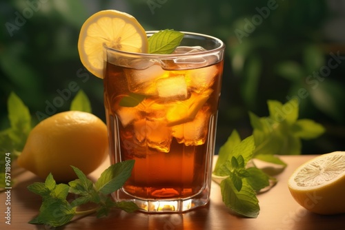 A glass of freshly brewed iced tea with lemon slices and a sprig of mint
