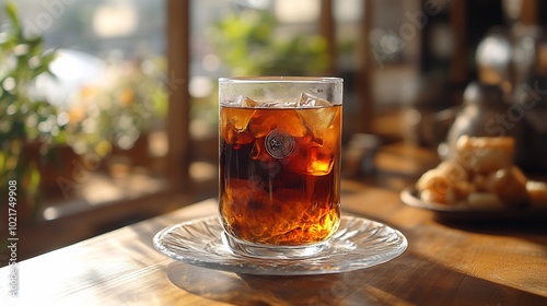 cafes, hot drink, iced, drink, cold, beverage, ice, glasses, table, wooden, saucer, eatery, bar, chill, refreshment, summer, fresh, sweet, brown, caffeine, morning, afternoon, day, sun, light, window, clear, liquid, ice cube, lounge, relax, enjoyment