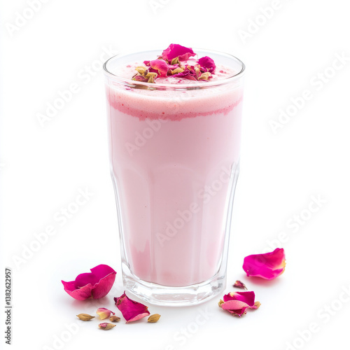 A glass of rose milk, with a refreshing drink made from milk and rose syrup, garnished with rose petals and sabja seeds, isolated on clean white background.