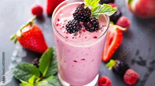 a glass of vivid colorful fruit smoothie with fruits all around