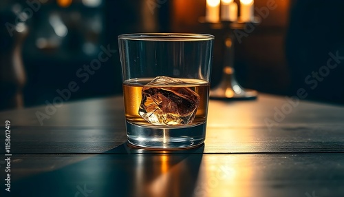 A glass of whiskey with a large ice cube, placed on a dark wooden surface, with soft candlelight reflections creating a luxurious and calm ambiance. Stock photography 32K, UHD, Ultra HD quality, high