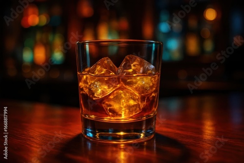 A Glass of Whiskey with Ice Cubes in a Blurred Bar Setting