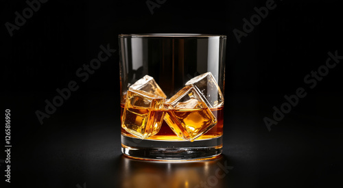 A glass of whiskey with ice cubes on a dark background. The amber liquid and clear ice create a striking contrast.