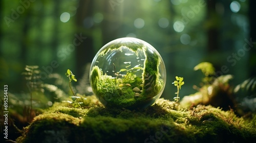 A glass orb nestled in a bed of vibrant moss and ferns, embodying the delicate beauty and resilience of nature's intricate and balanced ecosystems
