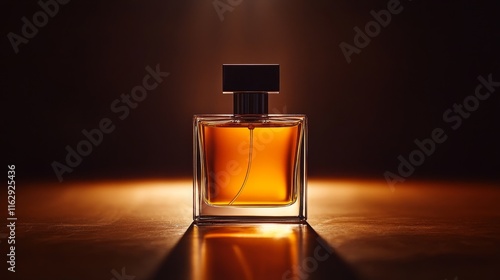 A glass perfume, mockup bottle illuminated against a dark background, showcasing its rich amber liquid.