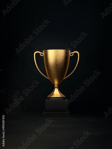 A gleaming golden trophy cup stands tall on a black pedestal, illuminated by dramatic lighting, signifying achievement, victory, success, recognition, and aspiration.