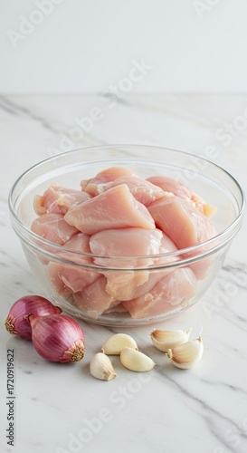 chicken breast, chicken, meat, food, cooking, meal, ingredient, onion, garlic, bowl, glass bowl, fresh, clean, marble, white background, healthy, savoury, raw, isolated, white, closeup, hand, uncooked, dinner, poultry, plate, animal, pink, ingredient, fillet, cook, pork meat, breast, red, cut, fish, beef, ham, cookery, delicious, epicure, bacon, diet