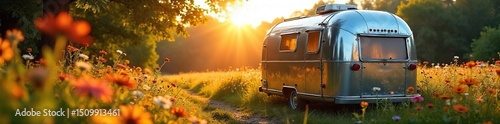 A glistening, antique travel trailer gleams in the morning sun, surrounded by lush, vibrant wildflowers Perfect for travel, adventure, and wanderlust imagery , meadow, peaceful