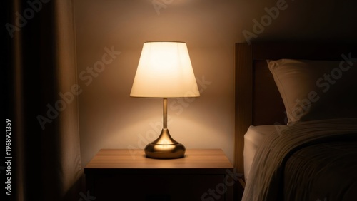 bed, lamp, night, light, glow, bedchamber, table, wooden, warm, soft, shade, metal, gold, bright, illumination, dark, shadow, closeup, comfort, relaxing, peaceful, atmosphere, interior, decor, headboard, pillow, sheet, dim, subtile, simple, elegant, classic, style, contemporary, modern, furniture, side, upright, center, focused, sharpened, ambience, tranquil, domestic, indoor, space, isolated, minimal, background