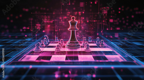 A glowing chessboard icon with digital strategy data surrounding it, symbolizing online gaming platforms, strategy analytics, and virtual tournaments.