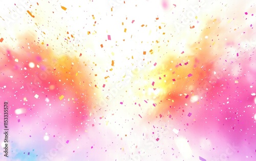 A glowing explosion of soft pastel gradients blending smoothly, surrounded by scattered bright particles, on a bright white background
