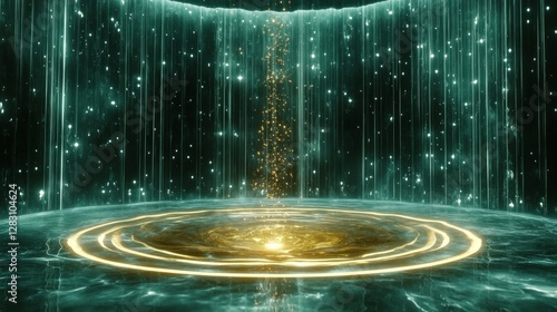 A glowing halo floats in mid-air within a sanctum of shimmering walls, its edges adorned with tiny, flickering stars. From the underside of the halo, a single droplet