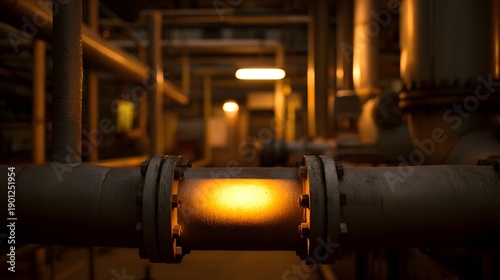 pipe, industrial, glow, yellow, light, factory, heat, energy, metal, steel, conduit, system, network, equipment, infrastructure, process, manufacturing, production, workshop, plant, interior, dark, ambient, warm, orange, bright, illumination, radiant, shine, atmosphere, moody, intense, technology, engineering, component, connection, joint, valva, flange, tube, mechanism, complex, abstract, gritty, textured, aged, power, output, design