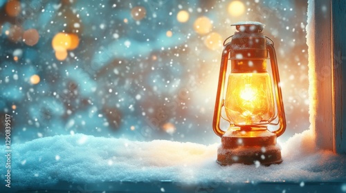 lantern, snow, winter, night, light, warm, cold, cosy, snowfall, window, glowing, illumination, dark, bright, fire, flames, outside, inside, scene, peaceful, serene, quiet, calm, still, atmosphere, holiday, season, festive, magical, rustic, vintage, old, metal, glasses, oil, fuel, illuminated, brightly, softly, falling, beautiful, lovely, charming, picturesque, wonder, hope, comfort, warmth, shelter