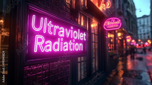 A glowing neon sign stating 'Ultraviolet Radiation' captured in a vibrant city street at night, illuminating the surroundings with a bright purple light.