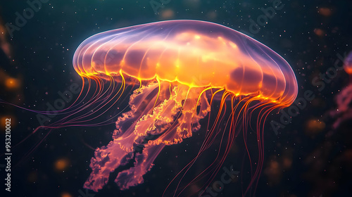 A glowing orange jellyfish with long tentacles swims in a dark blue water.