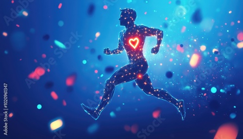 A glowing, running man with a heart on his chest in a blue background with bokeh lights.