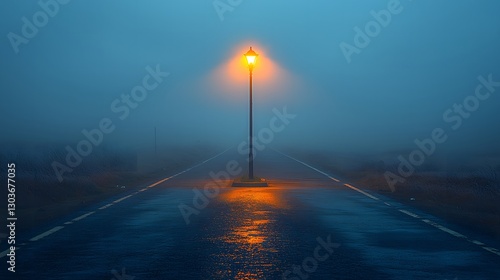 A glowing street lamp stands alone in thick fog on a deserted road. The soft light and mist create a mysterious and dreamlike atmosphere.