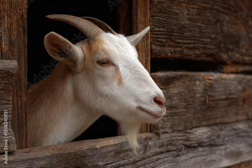 goat, animal, farm animal, farm, barn, window, wood, brown, horned, domestic, mammal, rustic, countryside, beard, natural light, daylight, closeup, soft focus, tranquil