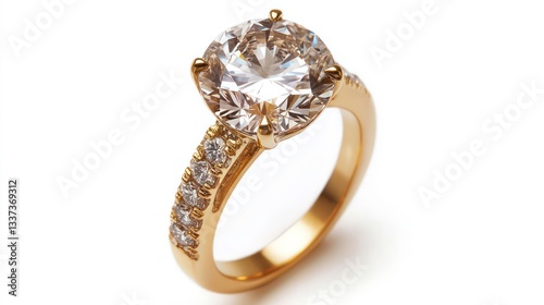 A gold engagement ring with a large, brilliant-cut diamond and smaller diamonds on the band. Perfect for jewelry websites, wedding announcements, or romantic designs symbolizing love, commitment, and