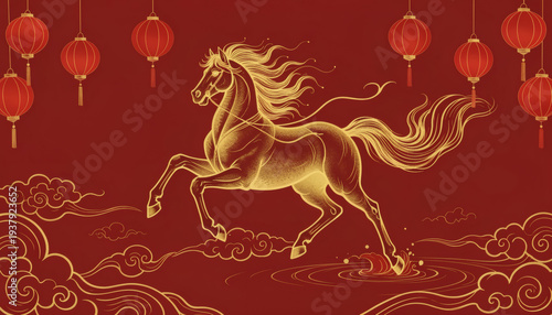 horse, galloping, with, water, background, ripple, a, hanging, and, red, gold, cloud, lantern, through, outlined, against, red background, chinese new year, lunar new year, mythical, fantasy, celestial, majestic, traditional, zodiac, prosperity, luck, spiritual, aethereal, dreamlike, decorative, illustration, graphic design, power, motion, elegance, festive