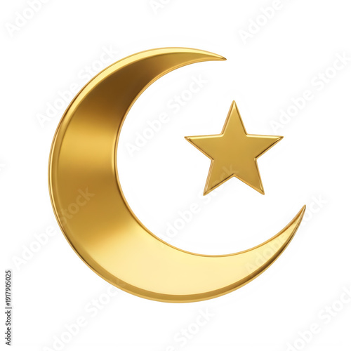 A golden crescent moon and star symbol on a white background