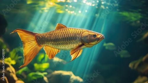 fish, underwater, water, gold, sunlight, beam, light, scale, fin, tail, swimming, aquatic, marin, animal, ocean, nature, background, bokeh, depth, closeup, detail, ripple, surface, clear, view, life, ecosystem, wildlife, creature, gold, yellow, brown, peaceful, calm, serene, beauty, tranquil, delicate, vibrant, movement, pattern, texture, environment, explore, scene, illustration, artistic