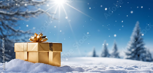 A golden gift box and bauble sparkle in the snow under a bright sun and gently falling snowflakes. Perfect for holiday cards, winter promotions, and festive designs.