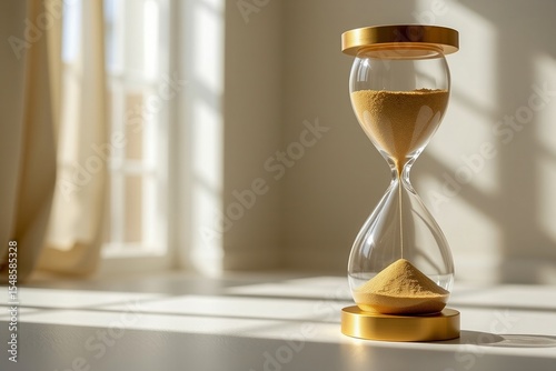 A golden hourglass with sand flowing inside sits on a white surface, illuminated by sunlight from a nearby window with soft beige curtains.