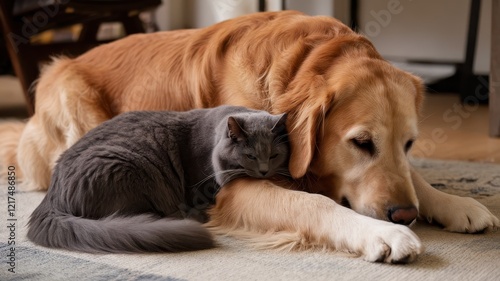 A golden retriever and a gray cat snuggling together on a soft rug, exuding warmth and friendship in a cozy indoor setting.