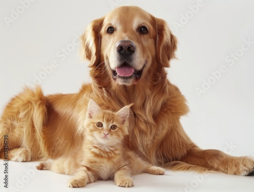 A golden retriever and a kitten are laying down.
