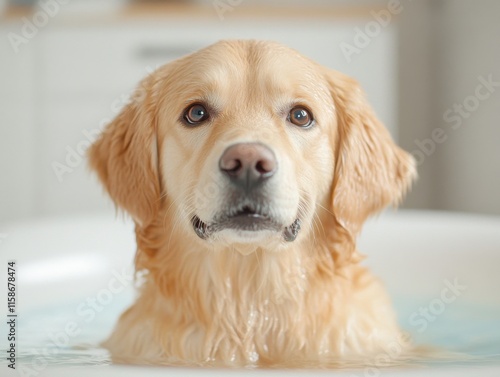A golden retriever enjoys a refreshing swim in a clear pool, its wet fur gleaming under soft daylight.