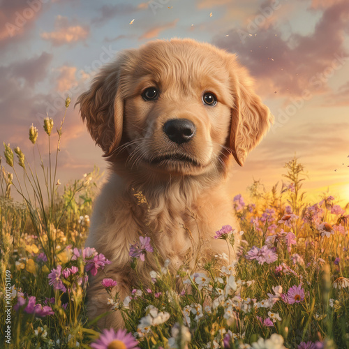 A golden retriever puppy with big, curious eyes and fluffy fur stands in a field of wildflowers as the sun sets