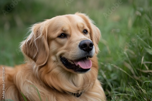 A golden retriever with a joyful expression rests in a lush field of green grass, embodying happiness and companionship under the gentle sun's warmth.