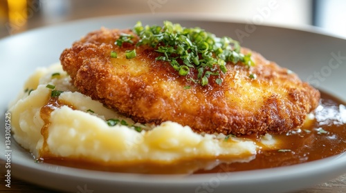 A golden-brown schnitzel or breaded chop, served alongside fluffy mashed potatoes, a classic comfort food that warms the heart and satisfies the soul.