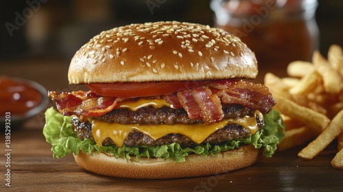 A gourmet burger with layers of crispy bacon, fresh lettuce, tomato, and melted cheese, with golden fries on the side