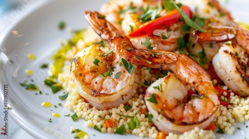 A gourmet dish of grilled shrimp served with couscous salad and drizzled with olive oil, plated elegantly.