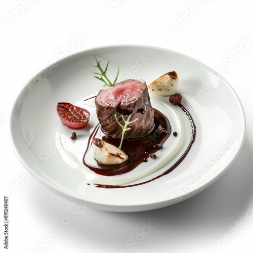 A gourmet dish with elegant plating, fine dining, realistic, isolated on white background
