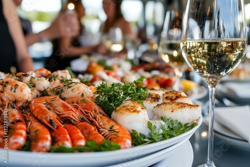 A gourmet display of seafood, including shrimp and scallops, served elegantly with white wine, underlining a pleasant and cheerful dining atmosphere.