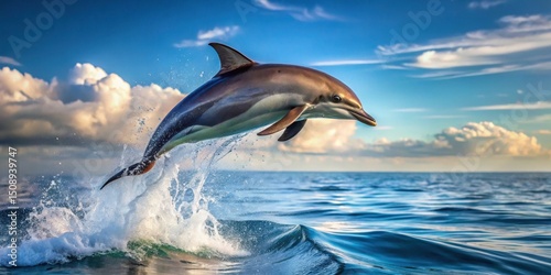 A graceful dolphin breaks through the ocean's surface, its sleek body arcing gracefully as it leaps into the air, wildlife photography, jumping animal