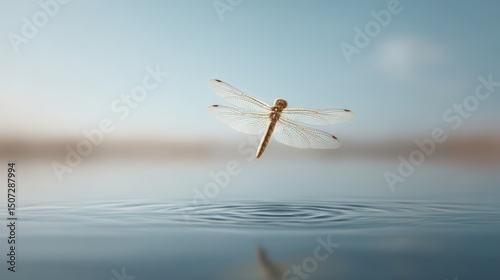 A graceful dragonfly hovers delicately over a serene body of water, reflecting soft colors in its wings