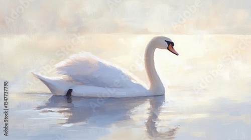 A graceful swan, impressionist painting style, gliding on a serene lake, soft morning light, horizontal composition