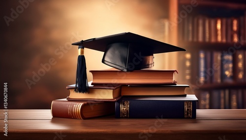 A graduation cap resting on a pile of academic books, symbolizing academic achievement and success. Perfect for themes of education, graduation, academic excellence, and scholarly milestones.