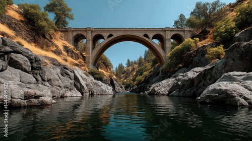 bridge, concrete, arch, river, vale, rock, water, landscape, nature, scenery, sunlight, tree, green, brown, yellow, grey, stone, calm, tranquil, view, forest, mountain, natural, beauty, creek, span, flow, wide, high, rugged, forested, riverbed, stone, sky, blue, sun, summer, exterior